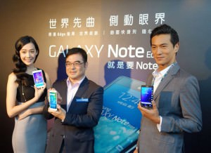 圖:三星今日正式宣佈GALAXY Note Edge在台上市,圖中為台灣三星電子行動與資訊事業部總經理杜偉昱,圖左為凱渥名模王心恬,圖右為凱渥名模鐘承翰。