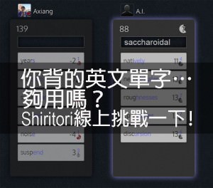 不過到底英文單要背多少才夠用呢?若以商用英文TOEIC測驗來說,想要達到550分左右的成績,大約需要背3500-5000個英文單字。當然,除了背單字,也需要常常把單字拿出來使用,才不會因為生疏而遺忘了這些單字。若是不喜歡考試,又想要測試一下自己對於單字的了解程度,那不妨可以來試試現在要介紹的這個線上網頁遊戲「Shiritori」,這個遊戲透過簡單的「PK對戰」,以英語單字「接龍」的方式,來不斷透過聯想輸入更多單字,只要能比對手更快達到字母數消除的目標,就能取得勝利哦!