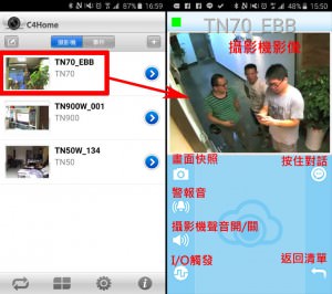 圖:在C4Home的攝影機清單中,點選一下預覽畫面,即可進入到攝影機影像顯示的畫面中,並可以透過影像下方的控制按鈕,來進行畫面快照(畫面的截圖)、啟動警報音、開關攝影機聲音、以及I/O觸發的控制(以「啟視錄TN70DB」來說,I/O觸發就是電鈴的啟動),甚至也可以利用「對話鈕」與攝影機端的其他人進行雙向對話。