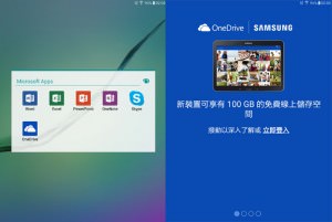 圖:在Galaxy Tab S2內建完整的微軟應用程式方案,包括雲端儲存、Office應用與即時通訊工具。透過Galaxy Tab S2登入OneDrive,更能享受到多達100GB的免費空間2年的優惠。