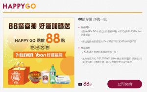 在前幾天,「HAPPY GO」也宣佈與全台最大的統一超商7-Eleven合作,讓「HAPPY GO」會員可以直接在店內的多媒體資訊機台「ibon」認証「HAPPY GO」會員,並能使用紅利點數兌換7-11的現金抵用卷、飲料、泡麵、零食與民生日用品…等。除此之外「HAPPY GO」也舉辦了「88驚喜抽」的活動,在活動網頁可以直接登入「HAPPY GO」會員並扣88點,即可兌換「ibon好運福袋序號」一組,能夠隨機獲得不同商品,運氣夠好的話,還有機會拿到遠超過88點價值的商品呢!