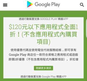 為了推廣Google Play的「電信代收」付款服務,Google Play即日起到6月30日前,只要透過指定連結或是輸入優惠代碼,就能兌換120元以下應用程式的「1折優惠券」!意思就是定價120元的應用程式,最後結帳只需要付12元就搞定了!而且一個Google帳號可以領取一次,建議大家可以好好把握機會,先領下來再慢慢考慮使用哦!