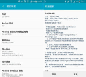 圖:Galaxy Note 4升級前(圖左)為Android 5.1.1版,基頻版本號PD3,升級後(圖右)為Android 6.01,基頻版本為DG4。