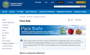 圖:美國聯邦航空總署的「Pack Safe」頁面,已公告新版Note7在機上攜帶與使用的禁令。