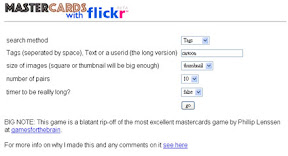 很多人都玩過「精神衰弱」的遊戲(也有人稱作記憶遊戲、配對遊戲),雖然遊戲規則很簡單,不過用來訓練腦力也是很不錯的方式。這個Master Card with Flickr是以Flickr為資料庫的精神衰弱遊戲,程式可以讓使用者指定特定的tag來搜尋Flickr的圖片,自動組成一組精神衰弱遊戲…