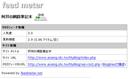 從名稱上來看不難猜到它的功能,沒錯,它就是測量你的Blog的Feed的小工具,它可以測出你的Blog的人氣度和更新頻率哦!除此之外,這個Feed Meter的網站還提供了排名的功能,可以和其他的Blog比較一番!