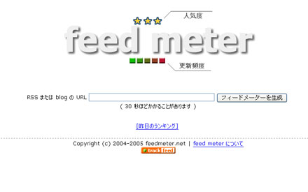 申請的方式容易,只要在Feed Meter的首頁上填上你的RSS Feed位址,按下“フイードメーターを生成”的按鈕,再將產生出來的程式碼貼進Blog的模板中就ok啦!有興趣的朋友快去試試看吧!