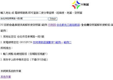 自從Google Earth的 服務開放後,想信很多人都玩得不亦樂乎。愈來愈多和Google Earth相關的網站也紛紛出現。不知道有沒有人和我一樣,對於找國內某個地點的地圖和座標傷腦筋,因為大多能查詢座標的網站都是英文的,也沒辦法輸入中 文地址,想要查某個國內地址的座標,可能還必須先想辦法將地址翻譯成英文的,甚至有時候在拼音方面出了問題,想查「武昌街」,結果變成了「五常街」……不 過,現在有更好的方法囉!