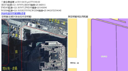 查詢出來的結果,可以看到一堆不同規格的座標數值,下面還附上空照圖(限台北地區)和地圖