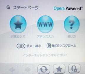 軟體基本的介面,預設頁面有基本操作教學(由左至右別為書籤、網址輸入和使用教學),A鍵為點選、B鍵為捲重動頁面、+/-可以放大/縮小畫面。下方的工具列按鈕分別為回前一頁、下一頁、Reload/Stop、書籤、Home