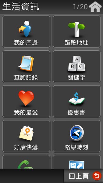 除此之外,便利性極高的「生活資訊」功能,提供了關鍵字、電話、地址、周邊生活訊息、七大大眾運輸路線的資訊查詢功能,讓你隨時都能掌握最新的生活娛樂訊息,甚至連電影院場次、各類旅遊書也都收納其中,包辦你的食衣住行育樂!