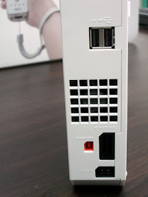 | Wii主機背面,USB插槽、散熱口、Sensor Bar接線孔、視訊輸出、電源線接口 |