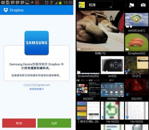 圖:在GALAXY S3之後的三星手機/平板,大部份都有整合了Dropbox的同步存取功能,因此我們在媒體瀏覽器中,除了裝置內的照片,也會有雲端空間的照片會出現在列表中。雖然這個功能還蠻方便的,但因為每一個人的雲端空間照片數量不同,所以也影響了讀取時的效能。