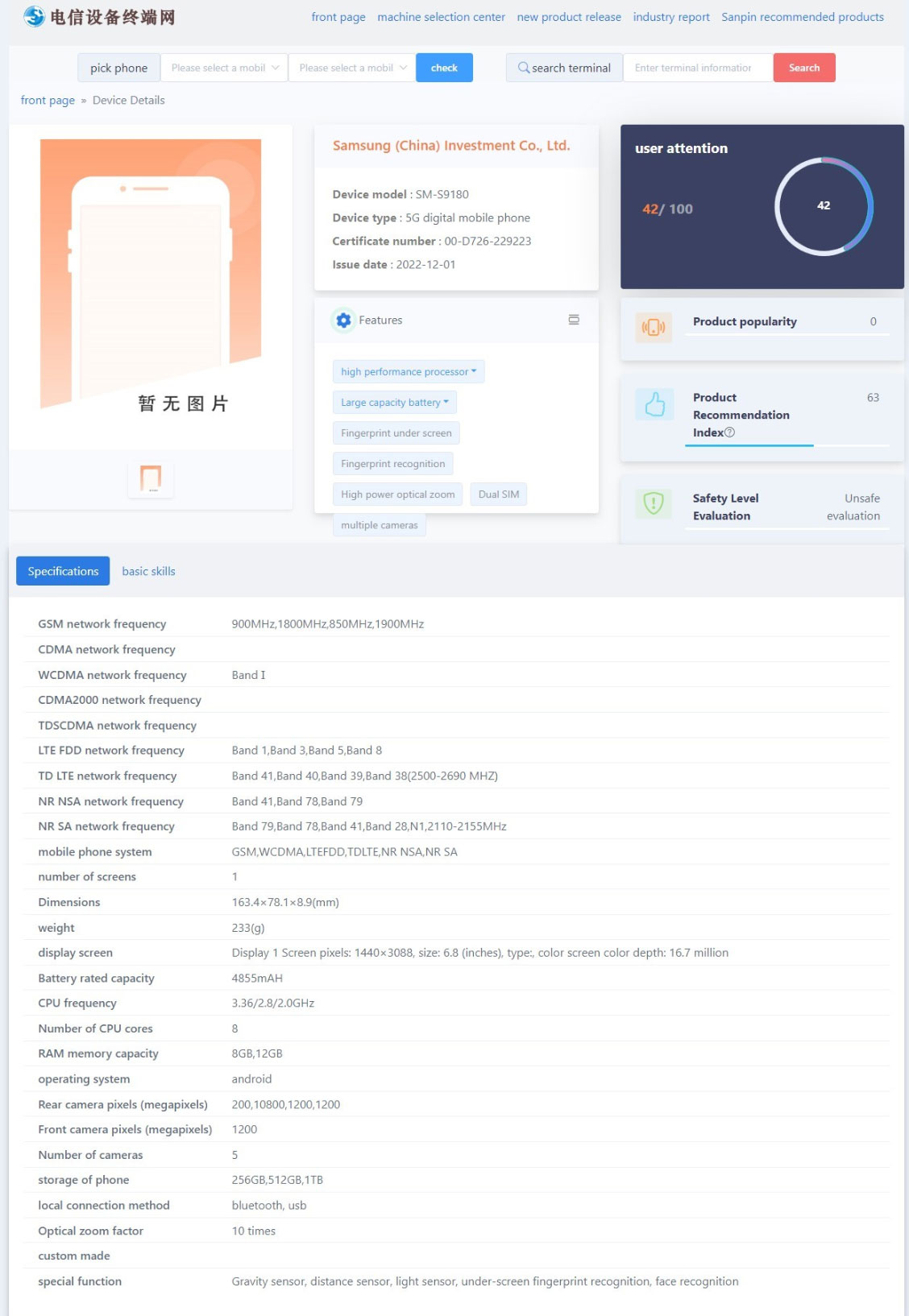 幾週前外媒在美國 FCC 發現了三星即將在明年推出的新機 Galaxy S23 與 Galaxy S23 Plus 的規格資訊,包括型號為 SM-S911B 與 SM-S916B ,電池容量分別為 3,900 mAh 與 4,700 mAh,同時也有處理器、顯示器尺寸、相機組成…等資訊,但獨缺最高階的 Galaxy S23 Ultra 的資訊,但沒想到爆料來得這麼快-根據外媒 GSMArena 的報導指出,中國的 TENAA (電信設備終端網)上已經曝光這這款型號為 SM-S9180 的新旗艦重要規格細節!