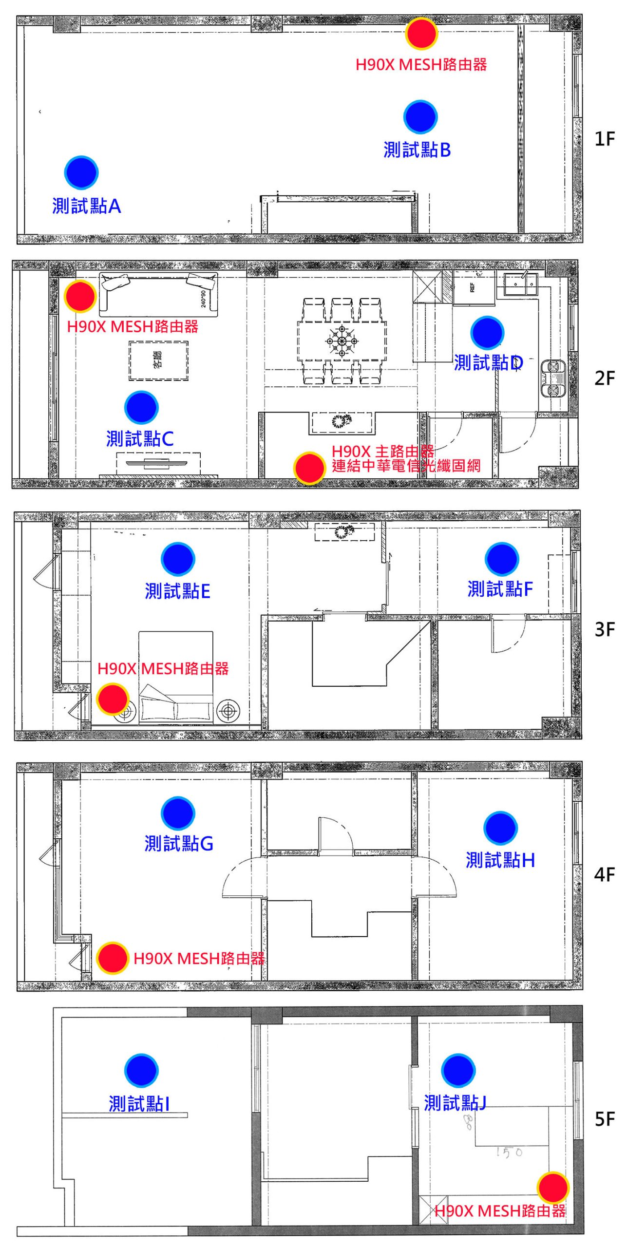 此次阿祥實測 MERCUSYS Halo H90X 的環境是家中透天厝的五個樓層,每一樓層的面積約 15 坪,主要路由器連結中華電信數據機設置於 1F – 2F 的樓梯間,另外設置五台分別設置於各個樓層中,並採有線回程方式串接為 Mesh Wi-Fi。在網路規格方面,家中使用的是中華電信光世代 500 M / 250 M 的方案,下面也為大家帶來不同位置的 Wi-Fi 收訊狀況與網路實測的結果。