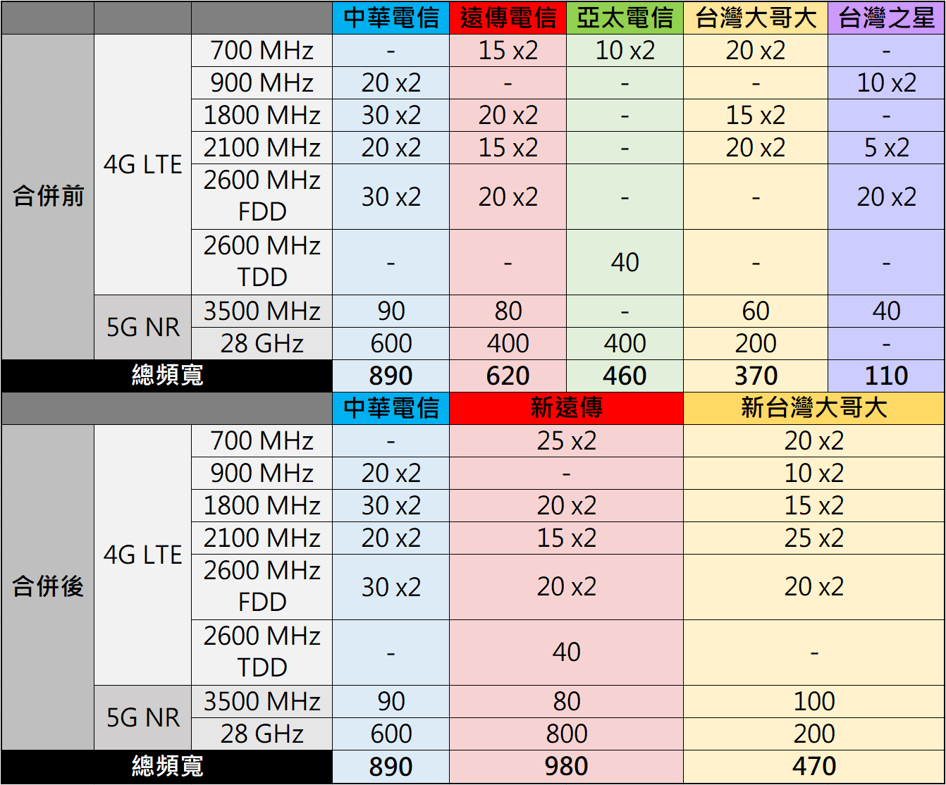 而另一個合併組合,台灣大哥大在 4G 頻段(700、1800、2100)的頻寬總和為 110MHz,5G 頻段(3500 MHz、28 GHz)頻寬總和為 260 MHz,台灣之星在 4G 頻段(900、2100、2600FDD)頻寬總和為 70 MHz,5G 頻段(3500 MHz)頻寬總和為 40 MHz,合併需扣除 700 或 900 頻段的 10MHz 頻寬,「新台灣大哥大」總頻寬將來到 470 MHz。
