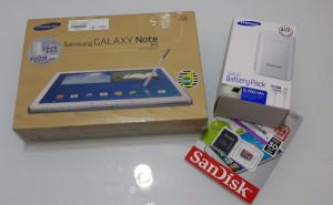 圖:本文開箱主角-GALAXY Note 10.1 2014 特仕版(我購買的是LTE版本),另外一起入手的還有目前活動搭購的三星原廠9000mAh行動電源一顆,以及我自行購入的SanDisk U1 SDXC 64GB一張。