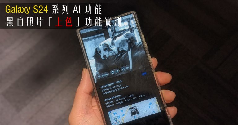 Galaxy S24 這個透過 AI 功能將黑白影像自動「上色」的功能並未在影像編輯或是生成工具之中,但它確實是存在於內建的「媒體瀏覽器」(相簿)之中,在觀看照片時,我們可以在照片上「向上滑動」來查看到照片拍攝的詳細資訊,包括拍攝時間、拍攝參數與地點…等,但同時影像上也會浮現其他的「影像建議」選項,這些功能會視影像類型而定,像是如果是人像,就會出現如同「背景柔焦」,若是黑白照片就會出現「上色」,而大部份的影像都會出現「重製」的自動強化選項。