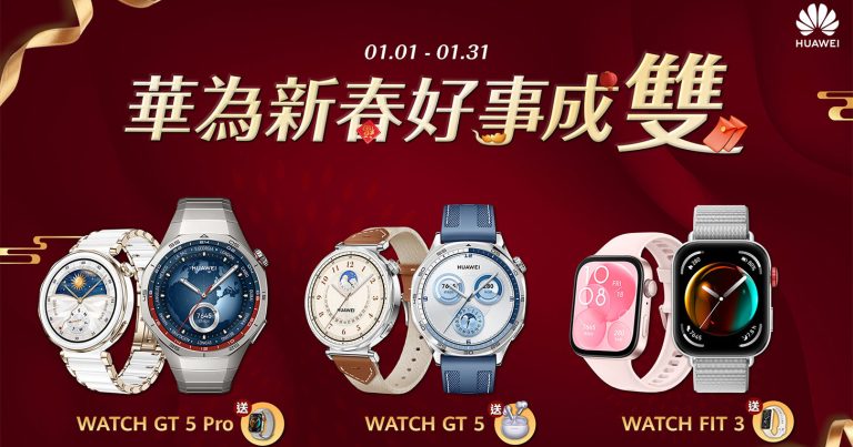 HUAWEI 新年開春推好事成雙優惠,包含 WATCH GT 5 系列、WATCH FIT 3 系列,即日起至 1 月 31 日,可至華為全通路包含燦坤、順發、全國電子、創 Q Space 品牌櫃及四大電商(PChome24h 購物/momo 購物網/YAHOO! 購物中心/蝦皮購物)購買,贈送好禮數量有限,送完為止!