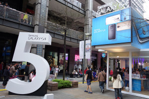 圖:三星的GALAXY S5「啟動你的心生活」體驗活動展場,位於台北市信義區新光三越A9旁的「香堤廣場」,也是假日人潮匯聚的所在。